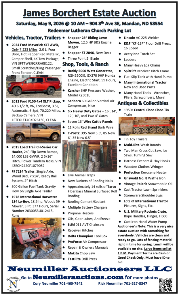 James Borchert Estate Auction Saturday, May 9, 2026 @ 10 AM 904 8th Ave SE, Mandan, ND 58554 Redeemer Lutheran Church Parking Lot Click Image Below For Full Gallery 153